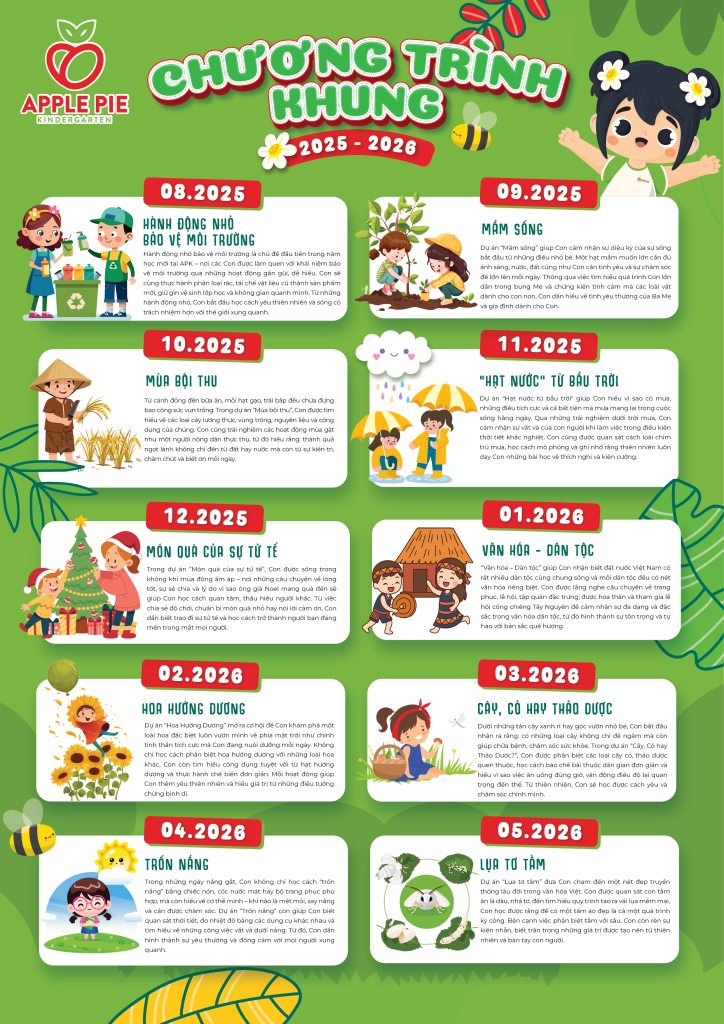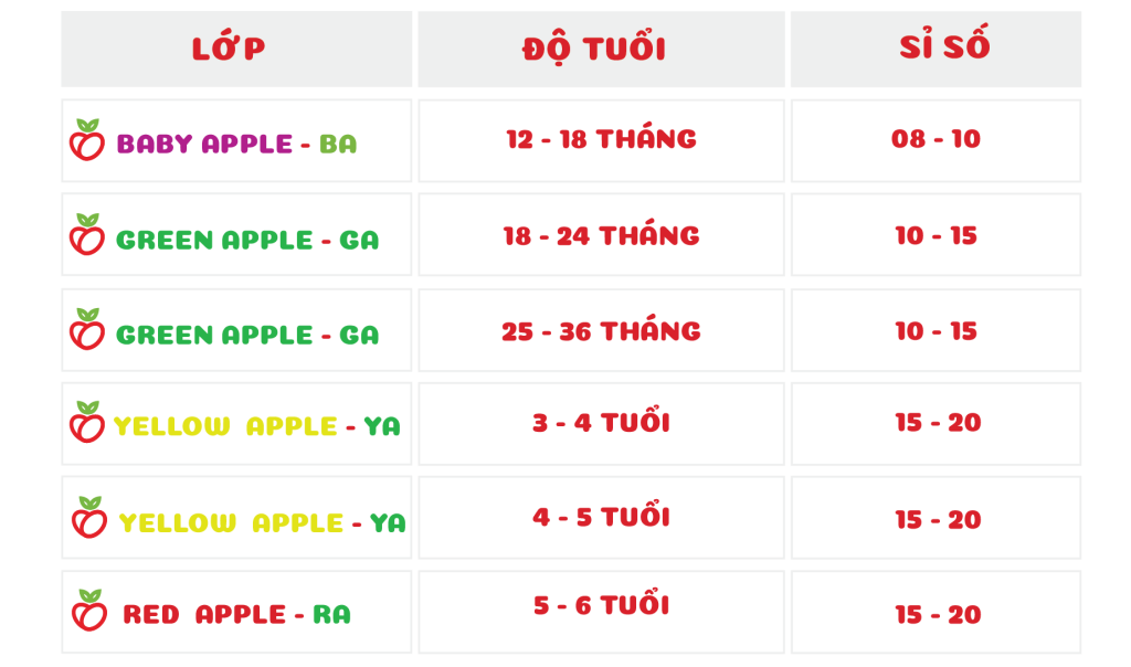 Trường Mầm non Apple Pie tuyển sinh các bé từ 12 tháng đến 5 tuổi vào mọi thời điểm trong năm.